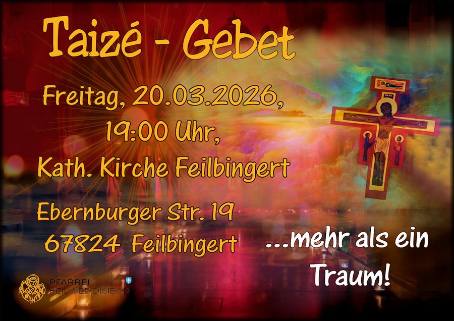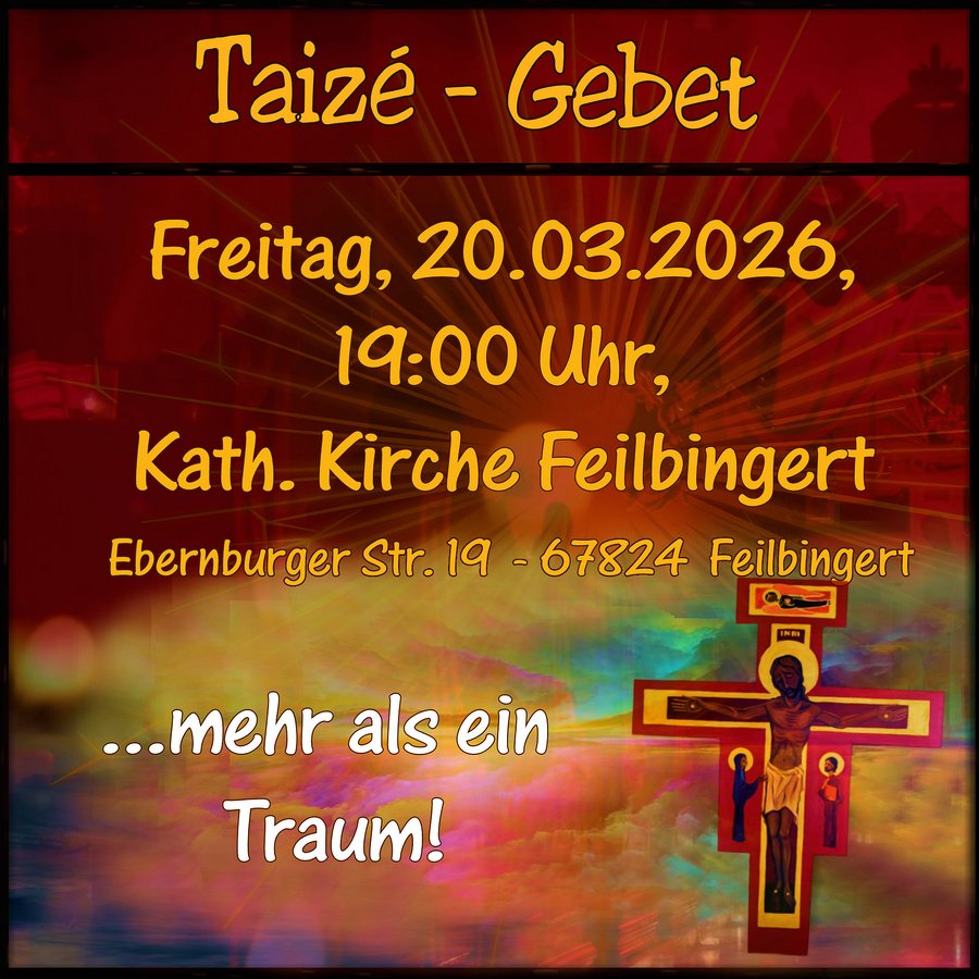 Am Freitag, 20.03., möchten wir Sie ganz herzlichst wieder zu unserem Taizé-Gebet um 19:00 Uhr in die kath. Kirche St. Michael in Feilbingert einladen.