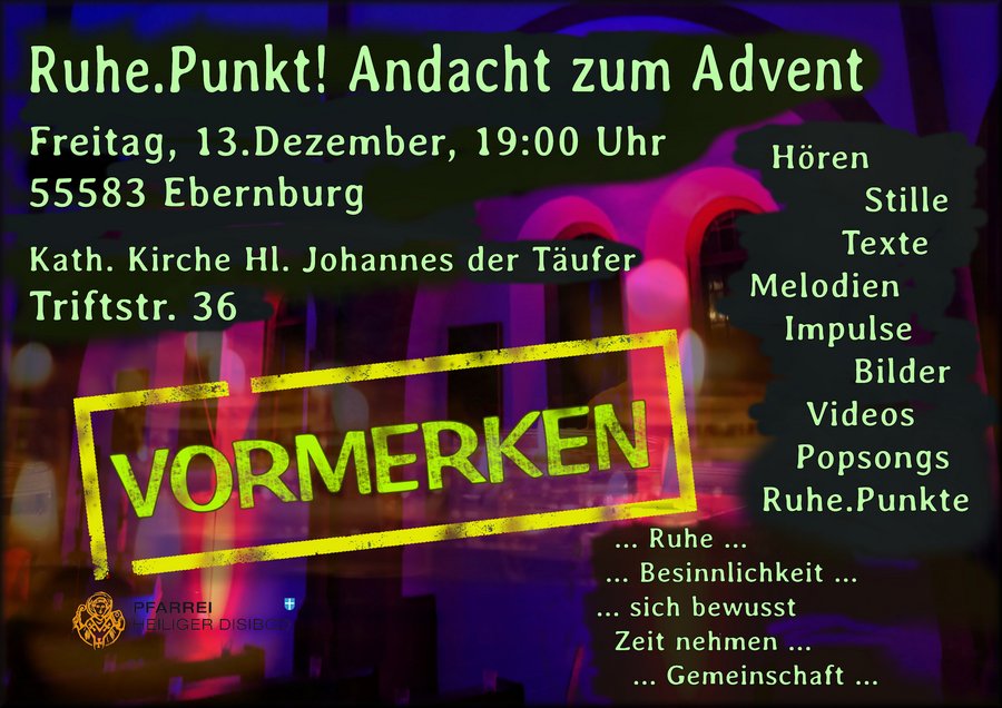 Am Freitag, den 13.12.2024, möchte die Pfarrei Heiliger Disibod wieder um 19:00 Uhr in die katholische Kirche Hl. Johannes der Täufer in Ebernburg zum Ruhe.Punkt im Advent einladen.