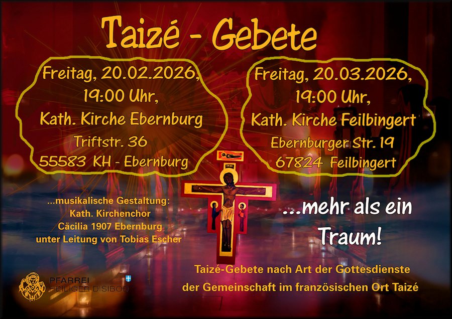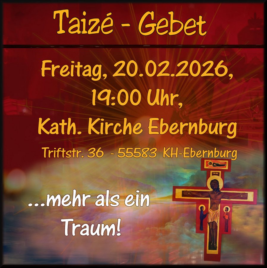 Am Freitag, 20.02., möchten wir Sie ganz herzlichst wieder zu unserem Taizé-Gebet um 19:00 Uhr in die kath. Kirche St. Michael in Ebernburg einladen.